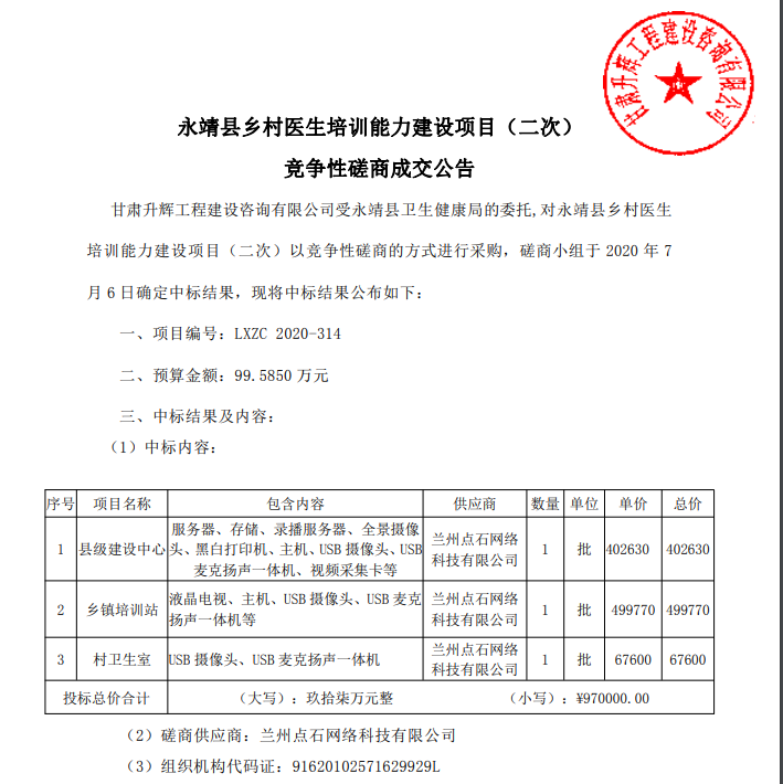 蘭州點(diǎn)石網(wǎng)絡(luò)科技有限公司近日捷報(bào)頻傳,在2020年7月6日憑借良好的公司信譽(yù)和可靠的技術(shù)力量,成功中標(biāo)“永靖縣鄉(xiāng)村醫(yī)生培訓(xùn)能力建