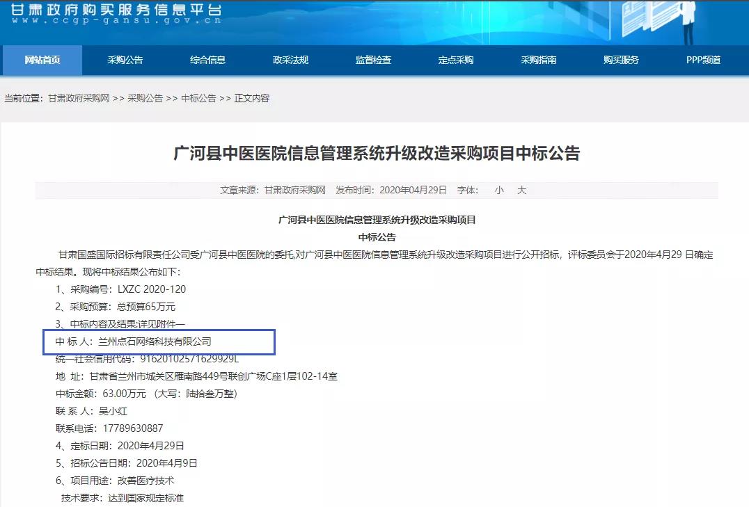2020年4月29日,蘭州點(diǎn)石網(wǎng)絡(luò)科技有限公司在“廣河縣中醫(yī)醫(yī)院信息管理系統(tǒng)升級(jí)改造采購項(xiàng)目”的競(jìng)標(biāo)中,憑借過硬的產(chǎn)品質(zhì)量、扎實(shí)高效的工作作風(fēng)、強(qiáng)大的技術(shù)實(shí)力以及良好的企業(yè)信譽(yù)以絕對(duì)的優(yōu)勢(shì)順利中標(biāo)。